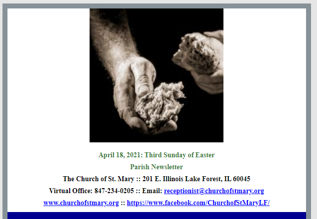 April 18, 2021: Third Sunday of Easter Apr 16 Written By Rebecca Quackenbush Church of St. Mary Parish Newsletter for April 18, 2021: Third Sunday of Easter. Rebecca Quackenbush