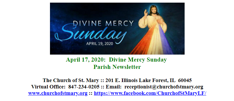 April 19, 2020: Divine Mercy Sunday Apr 17 Written By Rebecca Quackenbush Church of St. Mary Parish Newsletter for April 19, 2020: Divine Mercy Sunday. Rebecca Quackenbush