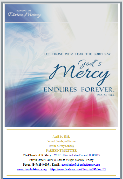 Church of St. Mary Parish Newsletter for April 24, 2022: Second Sunday of Easter Divine Mercy Sunday.