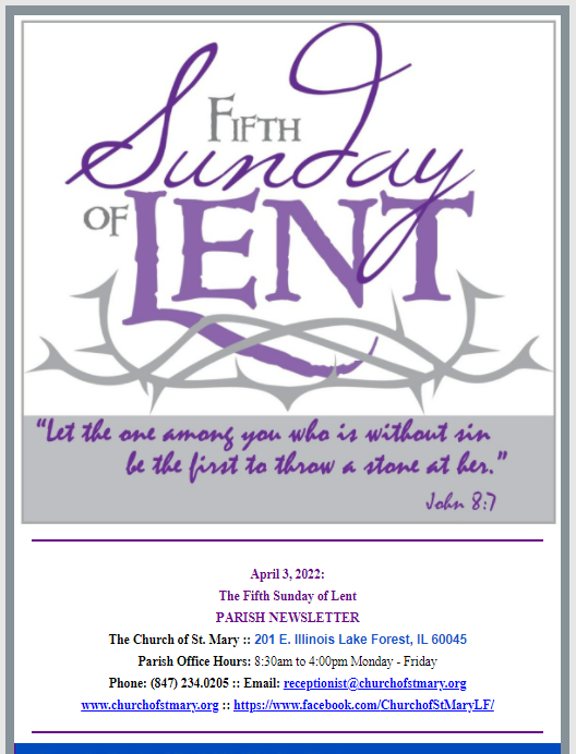 April 3, 2022:The Fifth Sunday of Lent Apr 4 Written By Rebecca Quackenbush Church of St. Mary Parish Newsletter for April 3, 2022: The Fifth Sunday of Lent. Rebecca Quackenbush