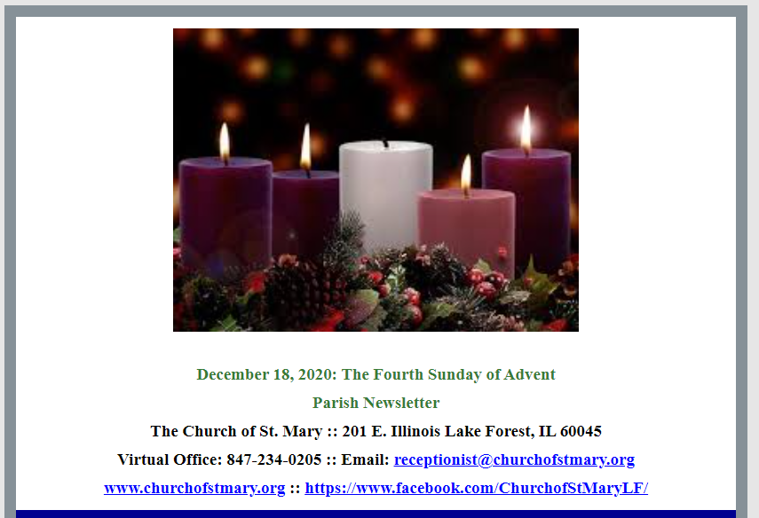 December 20, 2020: The Fourth Sunday of Advent Dec 18 Written By Rebecca Quackenbush Church of St. Mary Parish Newsletter for December 20, 2020: The Fourth Sunday of Advent. Rebecca Quackenbush