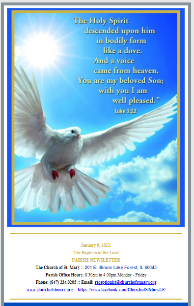 January 9, 2022: The Baptism of the Lord Jan 7 Written By Rebecca Quackenbush The Church of St. Mary Parish Newsletter for January 9, 2022: The Baptism of the Lord. Rebecca Quackenbush