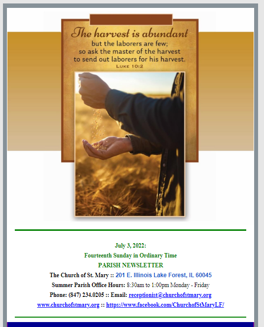 July 3, 2022:Fourteenth Sunday in Ordinary Time Jul 1 Written By Rebecca Quackenbush Church of St. Mary Parish Newsletter for July 3, 2022: Fourteenth Sunday in Ordinary Time. Rebecca Quackenbush