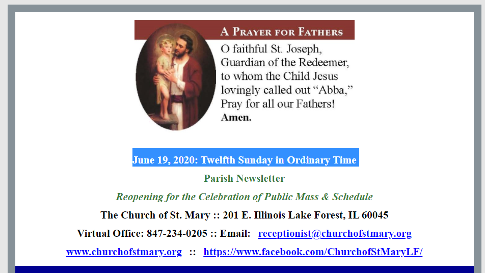 June 21, 2020: Twelfth Sunday in Ordinary Time Jun 19 Written By Rebecca Quackenbush Church of St. Mary Parish Newsletter for June 21, 2020: Twelfth Sunday in Ordinary Time. Rebecca Quackenbush