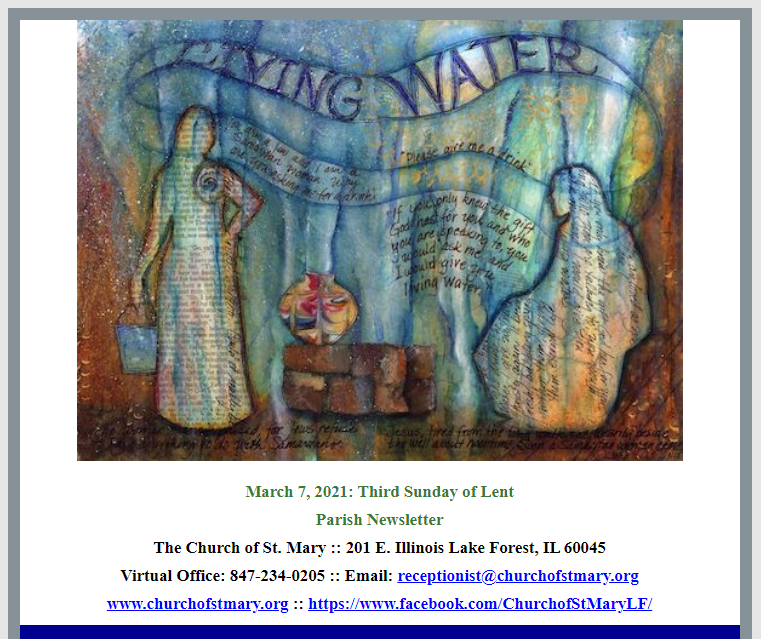 March 7, 2021: Third Sunday of Lent Mar 5 Written By Rebecca Quackenbush Church of St. Mary Parish Newsletter for March 7, 2021: Third Sunday of Lent. Rebecca Quackenbush