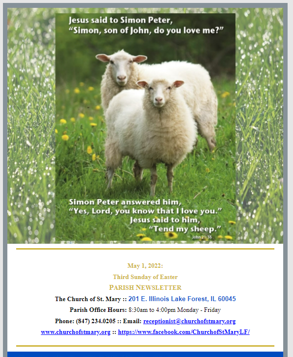 May 1, 2022:Third Sunday of Easter Apr 29 Written By Rebecca Quackenbush Church of St. Mary Parish Newsletter for May 1, 2022: Third Sunday of Easter. Rebecca Quackenbush
