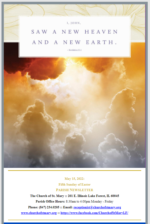 May 15, 2022:Fifth Sunday of Easter May 13 Written By Rebecca Quackenbush Church of St. Mary Parish Newsletter for May 15, 2022: Fifth Sunday of Easter. Rebecca Quackenbush