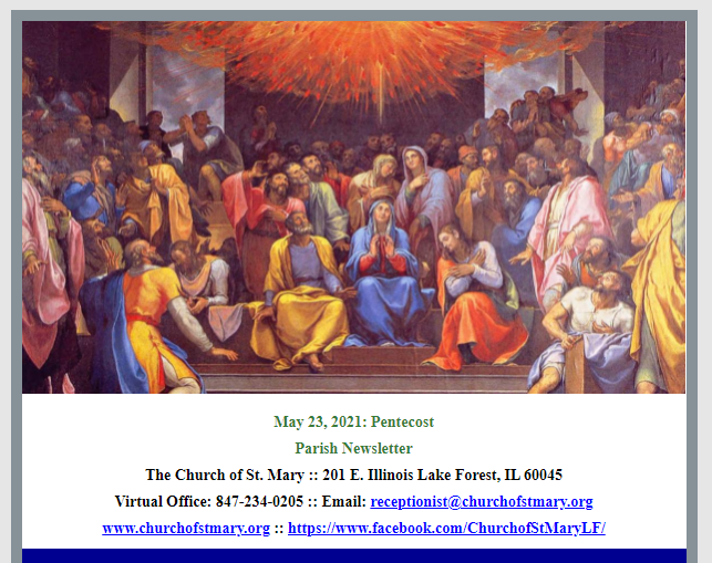 May 23, 2021: Pentecost May 21 Written By Rebecca Quackenbush Church of St. Mary Parish Newsletter for May 23, 2021: Pentecost. Rebecca Quackenbush
