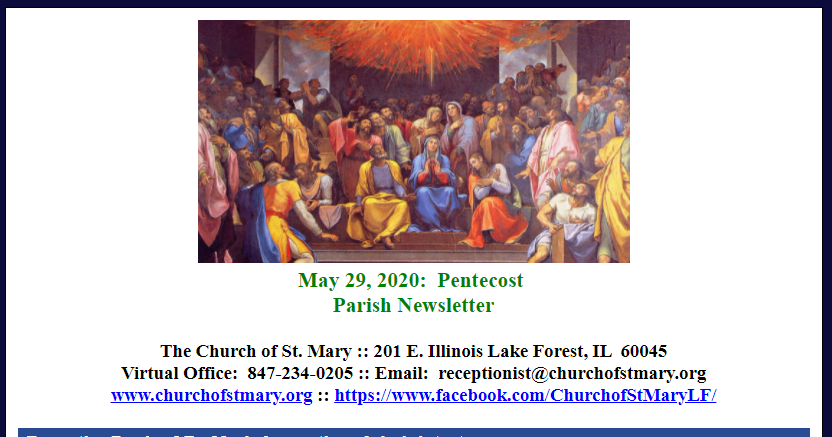May 31, 2020: Pentecost May 29 Written By Rebecca Quackenbush Church of St. Mary Parish Newsletter for May 31, 2020: Pentecost. Rebecca Quackenbush