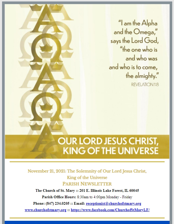 Church of St. Mary Newsletter for November 21, 2021: The Solemnity of Our Lord Jesus Christ, King of the Universe.
