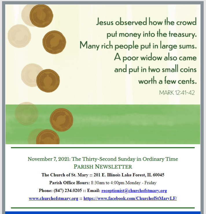 Church of St. Mary Parish Newsletter for November 7, 2021: The Thirty-Second Sunday in Ordinary Time.