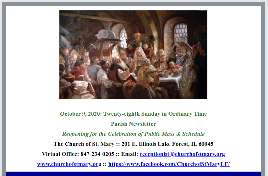 Find past years bulletins in the Bulletin Archive Rebecca Quackenbush 12/30/20 Rebecca Quackenbush 12/30/20 December 30, 2020: Epiphany of the Lord Read More Rebecca Quackenbush 12/23/20 Rebecca Quackenbush 12/23/20 December 23, 2020: The Holy Family of Jesus, Mary, and Joseph Read More Rebecca Quackenbush 12/18/20 Rebecca Quackenbush 12/18/20 December 20, 2020: The Fourth Sunday of Advent Read More Rebecca Quackenbush 12/11/20 Rebecca Quackenbush 12/11/20 December 13, 2020: The Third Sunday of Advent Read More Rebecca Quackenbush 12/4/20 Rebecca Quackenbush 12/4/20 December 6, 2020: The Second Sunday of Advent Read More Rebecca Quackenbush 11/27/20 Rebecca Quackenbush 11/27/20 November 29, 2020: The First Sunday of Advent Read More Rebecca Quackenbush 11/20/20 Rebecca Quackenbush 11/20/20 November 22, 2020: The Feast of Christ the King Read More Rebecca Quackenbush 11/13/20 Rebecca Quackenbush 11/13/20 November 15, 2020: Thirty-third Sunday in Ordinary Time Read More Rebecca Quackenbush 11/6/20 Rebecca Quackenbush 11/6/20 November 8, 2020: Thirty-second Sunday in Ordinary Time Read More Rebecca Quackenbush 10/30/20 Rebecca Quackenbush 10/30/20 November 1, 2020: Solemnity of All Saints Read More Rebecca Quackenbush 10/23/20 Rebecca Quackenbush 10/23/20 October 25, 2020: Thirtieth Sunday in Ordinary Time Read More Rebecca Quackenbush 10/16/20 Rebecca Quackenbush 10/16/20 October 18, 2020: Twenty-ninth Sunday in Ordinary Time Read More Rebecca Quackenbush 10/9/20 Rebecca Quackenbush 10/9/20 October 11, 2020: Twenty-eighth Sunday in Ordinary Time Read More Rebecca Quackenbush 10/2/20 Rebecca Quackenbush 10/2/20 October 4, 2020: Twenty-seventh Sunday in Ordinary Time Read More Rebecca Quackenbush 9/25/20 Rebecca Quackenbush 9/25/20 September 27, 2020: Twenty-sixth Sunday in Ordinary Time Read More Older Posts