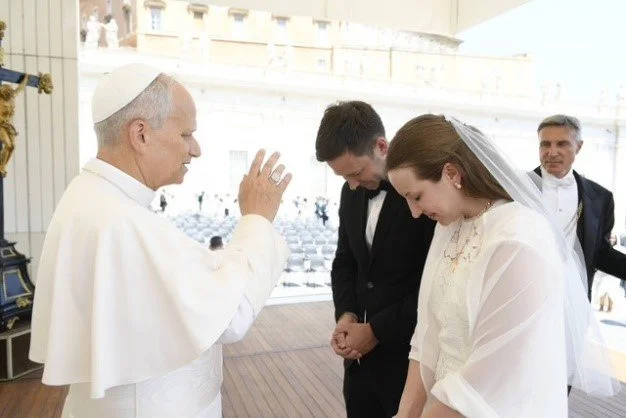 Many Catholics have it on their “bucket list” to go on a pilgrimage to Rome. Fr. Andre is going to Rome in the Jubilee Year as a “pilgrim of hope” later this year. He will carry with him any prayer intention you share with him, in advance of his pilgrimage. I will be giving him several intentions to offer during his pilgrimage. Many parishioners have been able to travel to Rome, as well as many other pilgrimage sites across the planet. (I am working on planning a pilgrimage next August – stay tuned for more details.) When in Rome, a high point is getting a ticket for the “general audience” in St. Peter’s Square outside of the Basilica. For those who have been fortunate to attend a papal audience, it is often a highlight of a pilgrimage to Rome. St. Peter’s Square fills with believers from around the world. St. Peter’s Square fills with people of every skin color known to man, all made in the image and the likeness of God. St. Peter’s Square fills with people who pray to God in every language spoken on the earth. Being present in St. Peter’s Basilica is a blessing, as a believer in Jesus Christ, one member among many of the worldwide Roman Catholic Church. Imagine being in St. Peter’s Square and being asked to come forward, to meet the Pope. Lauren McCabe was married to Justin Chambers on August 2, 2025, and they received a special blessing from Pope Francis at the Vatican during their honeymoon.